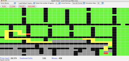 The agents thicken the walls marking cells as visited and leaving "corridors" of exploring cells to let the other go through. The corridors are closed when the last agent go through them, and we can tell when the algorithm terminates.